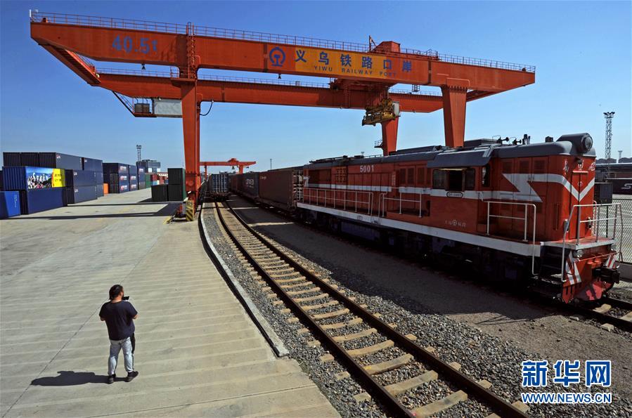 在浙江義烏鐵路西站,一列駛往西班牙馬德里的中歐班列(義烏)緩緩發(fā)車(10月27日攝)。 新華社記者 譚進(jìn) 攝