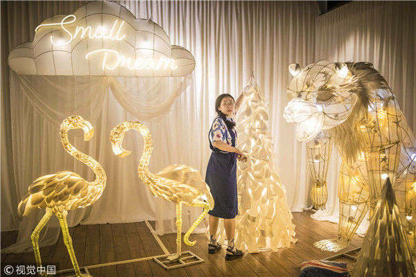 2018年5月6日,廣州,在天河區(qū)一家大商場辦個展時,用紙片做成的北極熊、大松樹、火烈鳥、紙房子在光線的配合下美輪美奐,吸引了很多顧客駐足。“幾乎每個人一看到,都會走進那個夢幻的場景里,和這些紙雕一起合影?!眻D片攝于2018年5月6日。南塘/視覺中國