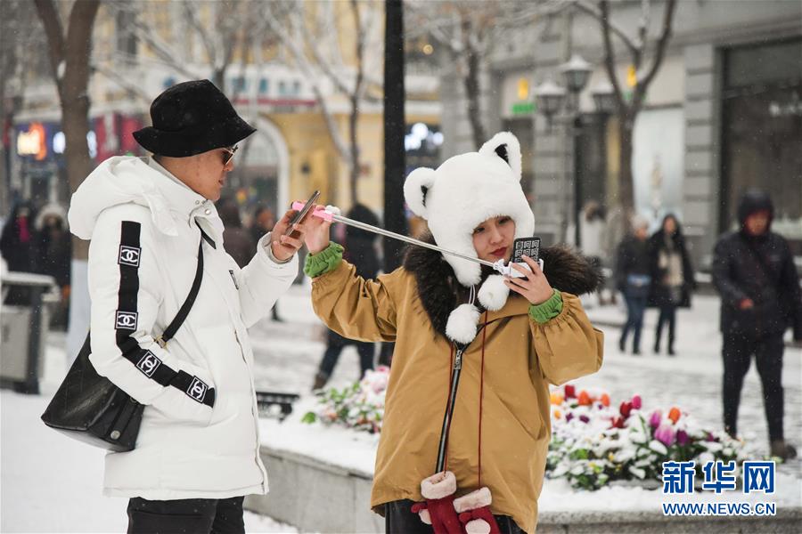 12月21日,游客在哈爾濱中央大街自拍。當(dāng)日,“冰城”哈爾濱迎來降雪天氣,整個城市變得銀裝素裹。新華社記者韓宇攝