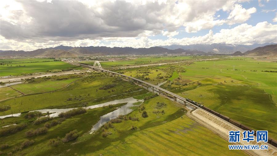 列車在青藏鐵路延長(zhǎng)線拉日鐵路上行駛(2016年6月17日無(wú)人機(jī)拍攝)。 新華社記者 劉東君 攝