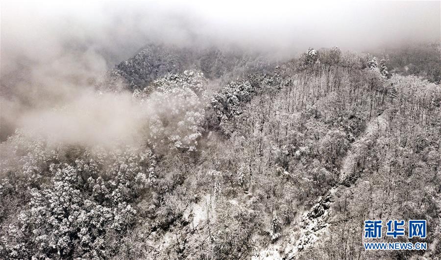 11月8日無(wú)人機(jī)拍攝的銀裝素裹的鬼谷嶺國(guó)家森林公園主峰。 新華社記者陶明攝