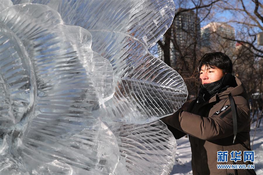 12月27日,選手在比賽中完善冰雕作品。 當日,第十六屆黑龍江省大學生冰雕藝術(shù)設(shè)計創(chuàng)作大賽在哈爾濱兆麟公園落下帷幕,全省高校共有99支隊伍參賽。 新華社記者曹霽陽攝