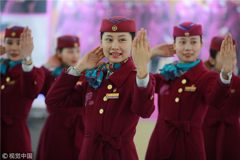 2018年12月27日,四川成都,為備戰(zhàn)即將開通的成雅鐵路,中國(guó)鐵路成都局集團(tuán)有限公司成都客運(yùn)段動(dòng)車二隊(duì)對(duì)成雅動(dòng)車的乘務(wù)人員進(jìn)行理論、形體、服務(wù)禮儀等內(nèi)容的培訓(xùn)。