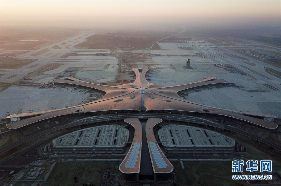12月29日拍攝的北京大興國際機(jī)場(無人機(jī)拍攝)。 當(dāng)日,在北京大興國際機(jī)場,隨著清晨第一縷陽光灑在航站樓古銅色的屋頂上,寓意“鳳凰展翅”的航站樓呈現(xiàn)出金光燦燦的景象。 新華社記者 鞠煥宗 攝 圖片來源:新華網(wǎng)