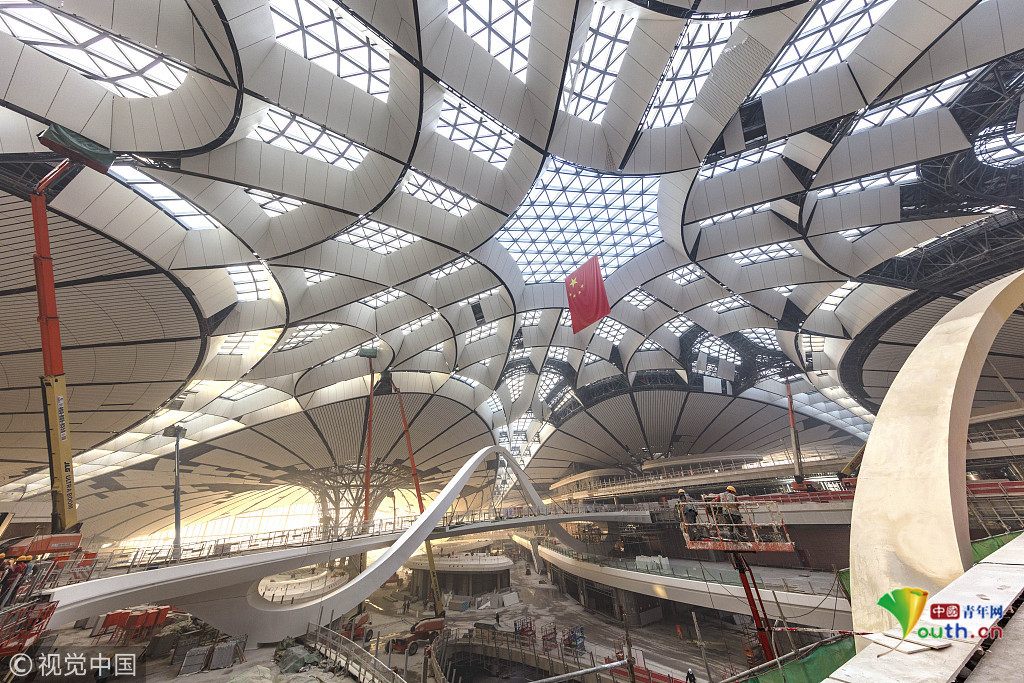 2018年12月19日,北京大興國際機場航站樓的室內裝修正在推進中。視覺中國