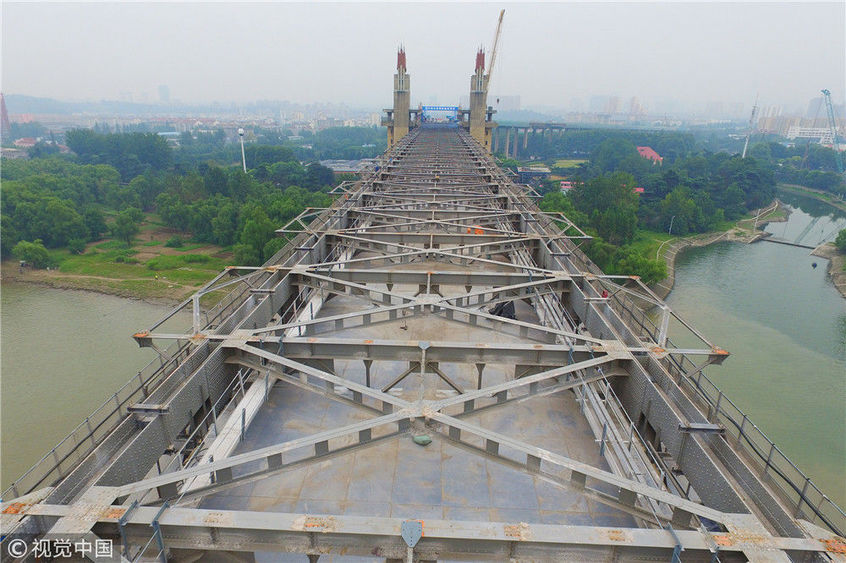 2017年9月19日,南京長江大橋正橋的混凝土面板已經全部拆除,僅剩交錯縱橫的鋼桁架橫跨在長江之上,從高空俯瞰猶如一條“鋼鐵巨龍”。