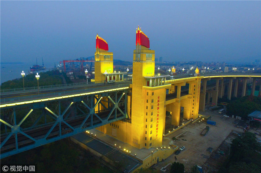 2016年10月28日晚,服役48年的南京長江大橋正式封閉,進入合同工期長達27個月的改造提升期。身為我國橋梁建設領域的扛鼎之作,南京長江大橋的此次封閉改造牽涉到公路繁忙、鐵路風險、技術攻關、文物保護等諸多難點,不僅影響面廣,而且社會關注度極高。如今,隨著整個工程進入收尾階段,即將于2018年12月底正式通車。圖為2018年12月13日,夜幕降臨,南京長江大橋歸位后的玉蘭花燈重新點亮。大橋玉蘭花燈柱共有299根,每根燈柱上有5盞玉蘭花燈,1大4小,一共1495盞。