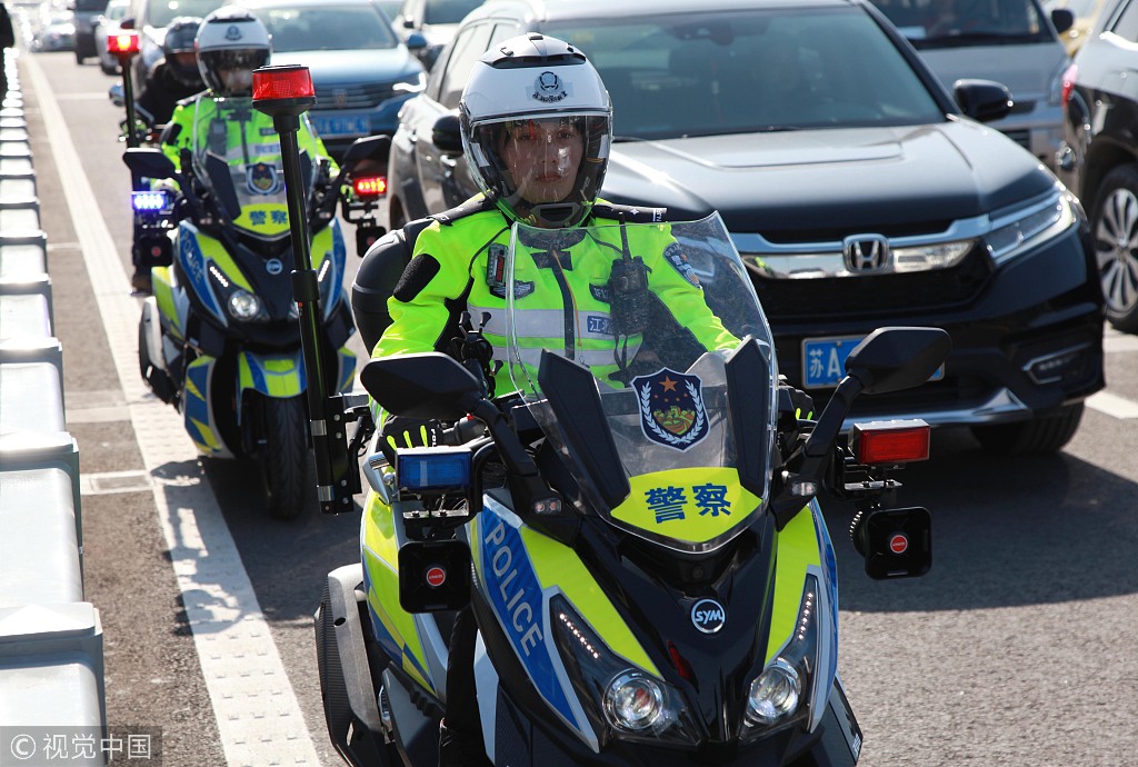 “江北新區(qū)分局交警支隊大橋特勤隊”的騎警隊員身著靚麗的熒光綠制服,騎行在南京長江大橋上巡邏。
