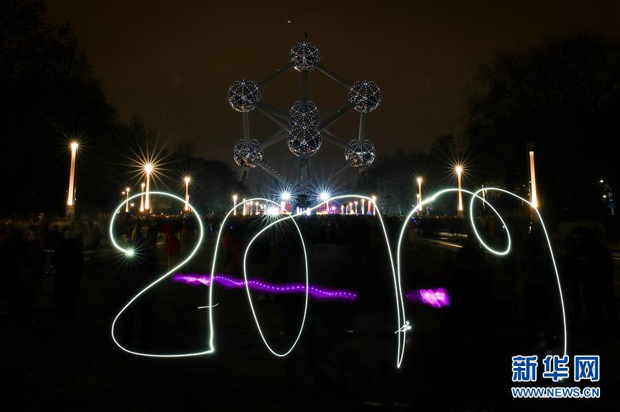 2018年12月31日,游客在比利時(shí)首都布魯塞爾的地標(biāo)性建筑——原子球塔前用光繪出2019的字樣,迎接即將到來的2019年。 新華社記者鄭煥松攝