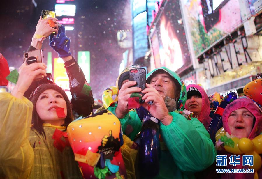 1月1日,在美國紐約時(shí)報(bào)廣場,人們在雨中參加跨年活動(dòng)。 新華社記者秦朗攝