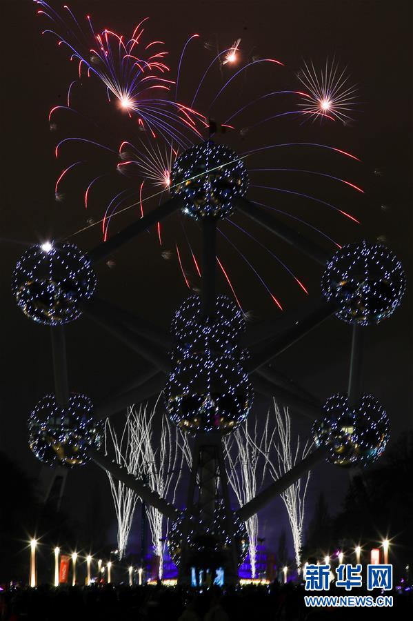1月1日,比利時(shí)首都布魯塞爾的地標(biāo)性建筑——原子球塔附近煙花綻放。 新華社記者鄭煥松攝