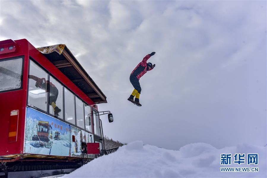 1月1日,在新疆禾木雪鄉(xiāng),一名游客體驗“跳雪”。