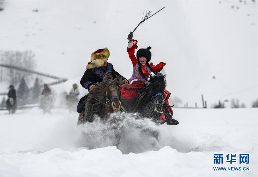 1月1日,在新疆禾木雪鄉(xiāng),當?shù)鼐用癖硌荨把┑毓媚镒贰薄?/p>