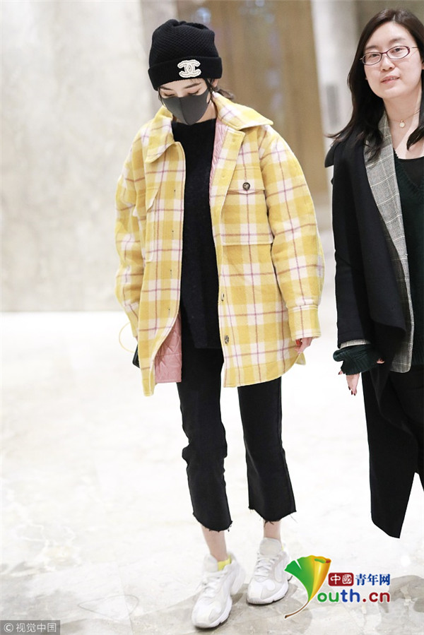 2018年1月6日,上海,楊冪現(xiàn)身某酒店。她戴著帽子口罩,身穿黑色套裝,而外面搭配的奶黃格子外套卻瞬間減齡,明亮又惹眼,無(wú)懼寒冬露著纖細(xì)腳踝,依舊是那個(gè)很會(huì)穿搭的大冪冪。