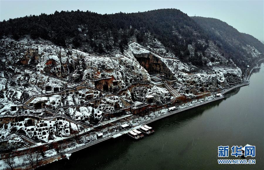 1月9日無人機拍攝的洛陽龍門石窟雪景。 新華社記者李安攝