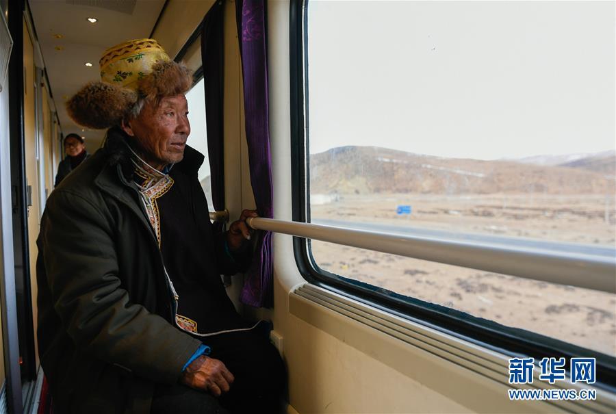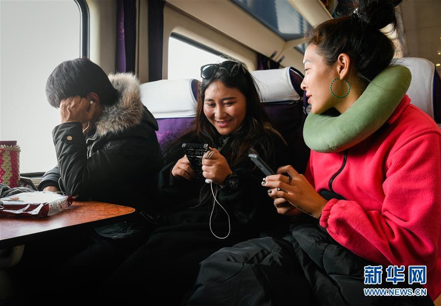 大學(xué)生剛措(右)和桑旦措姆(中)放寒假乘坐Z6802次列車(chē)回老家那曲(1月11日攝)。
