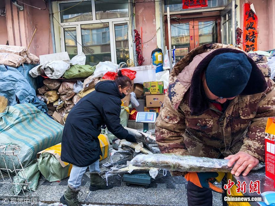 1月12日,黑龍江省佳木斯市撫遠(yuǎn)東極魚市,商戶在整理凍魚。棋簿紫 攝 圖片來(lái)源:視覺中國(guó)
