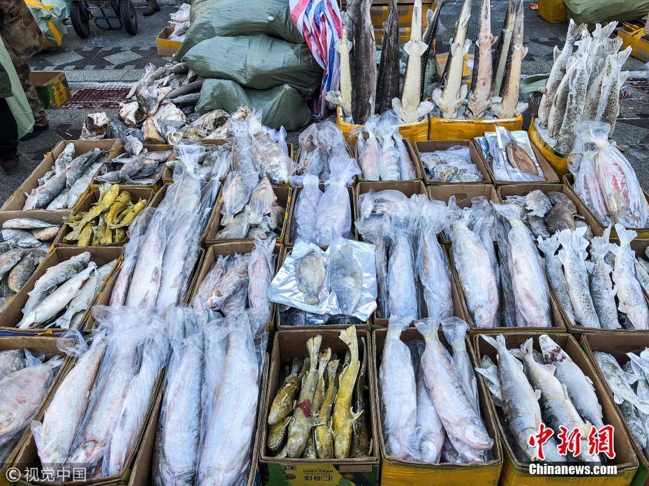 1月12日,黑龍江省佳木斯市撫遠(yuǎn)東極魚市,撫遠(yuǎn)東極魚市的凍魚。棋簿紫 攝 圖片來源:視覺中國