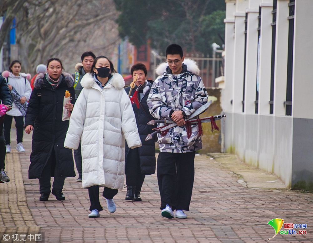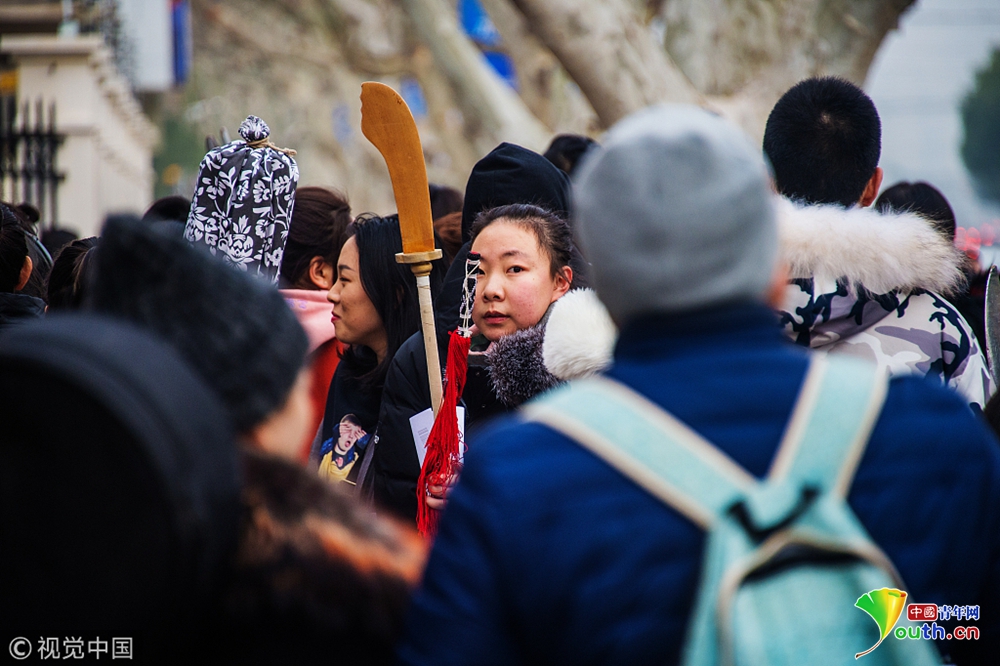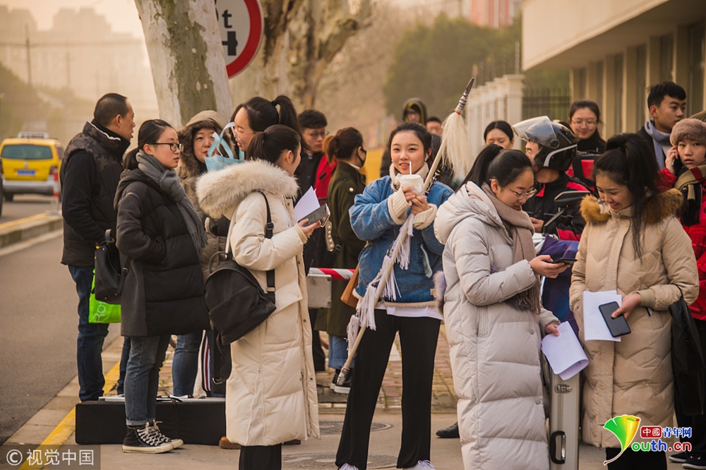 2019年1月14日,上海,上戲“藝考”第一階段第一天,不少考生從全國各地趕來,有的帶著樂器,有的帶著“刀槍”,在考點門口候考時,還不時地練習(xí)下。