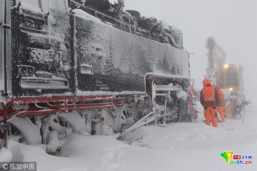 當(dāng)?shù)貢r(shí)間2019年1月9日,德國錫爾克,一輛蒸汽火車被大雪困住無法前進(jìn)。