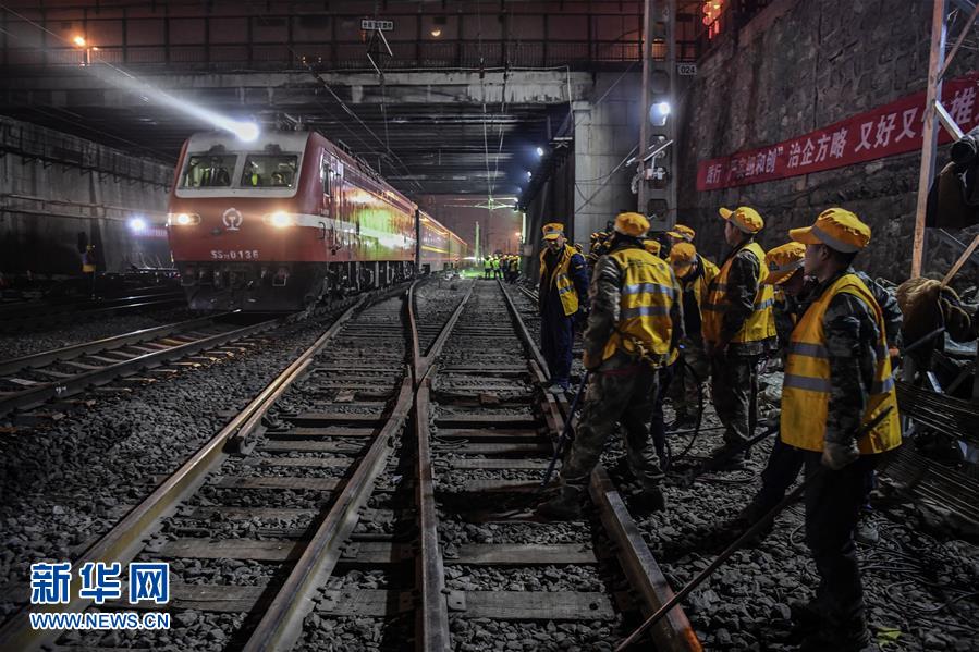 1月15日凌晨,中鐵十一局施工人員在西安站改現(xiàn)場等待列車通過,準備進行施工。新華社記者陶明攝