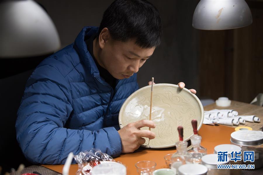 1月15日,吳榮強(qiáng)在龍泉市牛頭嶺村“七分醉”工作室對(duì)一件青瓷器皿進(jìn)行漆繕。