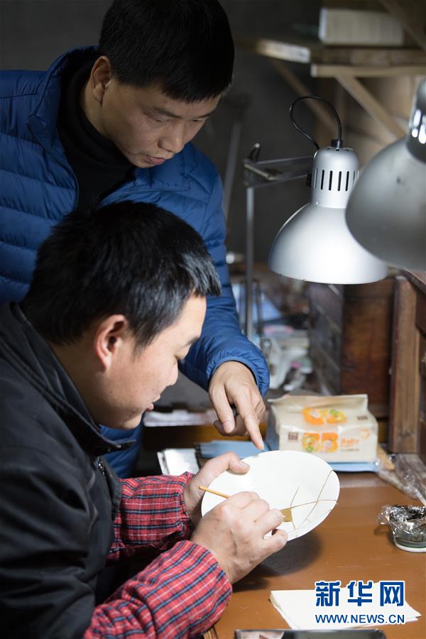 1月15日,在龍泉市牛頭嶺村“七分醉”工作室,吳榮強(上)指導一名徒弟進行漆繕。 新華社記者翁忻旸攝