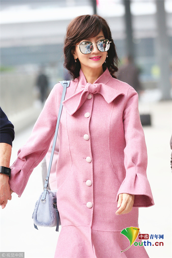 趙雅芝著粉嫩魚尾大衣優(yōu)雅甜美 獲老公一路牽手