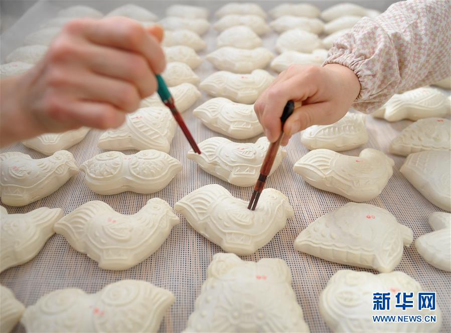 1月31日,河北省黃驊市一家面花作坊的工人給剛剛出籠的面花點(diǎn)上寓意吉祥喜慶的紅點(diǎn)。 河北黃驊市有著過(guò)年蒸面花的習(xí)俗。春節(jié)前夕,當(dāng)?shù)孛婊ㄖ谱鞴S加班加點(diǎn)制作面花,供應(yīng)春節(jié)市場(chǎng)。 新華社記者牟宇攝