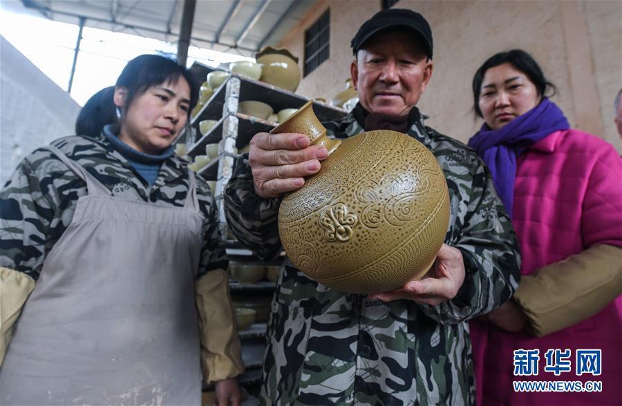 2月16日,陳新華(中)與徒弟們查看農(nóng)歷新年第一窯燒制好的婺州窯天球瓶。新華社記者 徐昱 攝