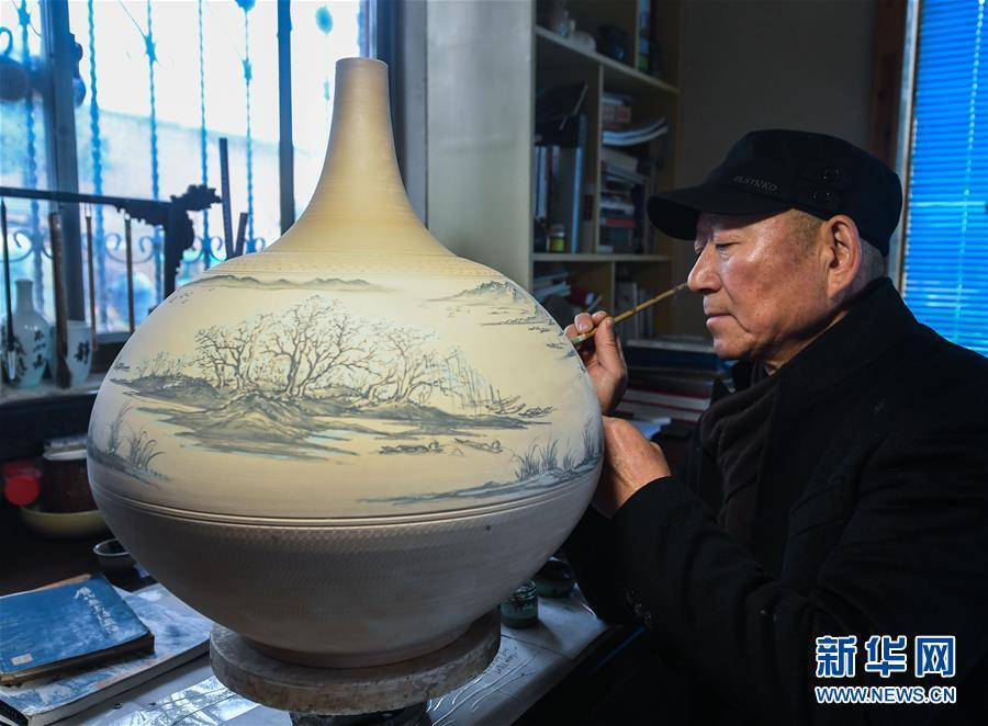 2月16日,陳新華在一個婺州窯大容瓶上進(jìn)行釉下褐彩的創(chuàng)作。新華社記者 徐昱 攝