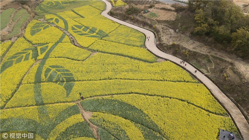 2019年近日,在云南省安寧市山口村,油菜花田里“長出”一朵巨大的“山茶花”,吸引游客到此觀賞拍照。圖為3月1日,航拍油菜花田中的山茶花圖案。劉冉陽(云南分社)/中新社/視覺中國