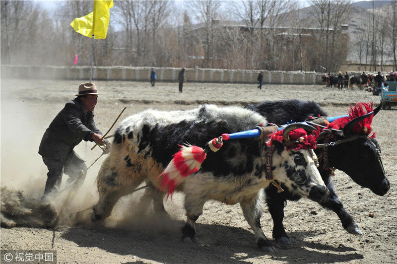 圖為白朗縣洛江鎮(zhèn)農(nóng)牧民進(jìn)行“賽?!被顒?dòng),只要農(nóng)牧民不從犁上掉下來(lái),便可以獲得一把象征著勞動(dòng)致富的鐵鍬。