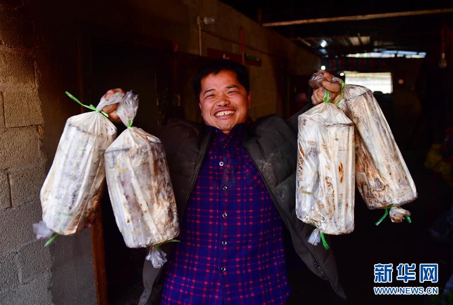 在廣西融水苗族自治縣桿洞鄉(xiāng)堯告村,貧困戶韋玉元在苗坪嶺藥材種植專業(yè)合作社里領取靈芝菌棒(3月11日攝)。