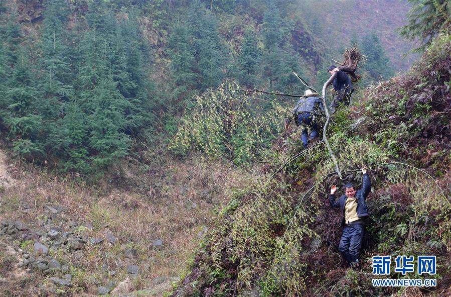 這是黔桂烏英苗寨的群眾在山上抬樹苗,準備用來美化居住環(huán)境(3月16日攝)。
