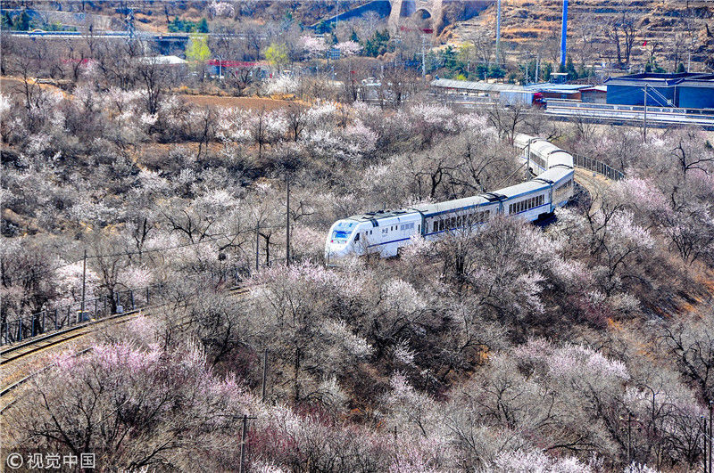 2019年3月22日,北京居庸關(guān)附近的山花盛開,S2線列車穿行在花海之中,構(gòu)成一幅美麗的畫面。時永平/千龍圖像/視覺中國 編輯/陳進