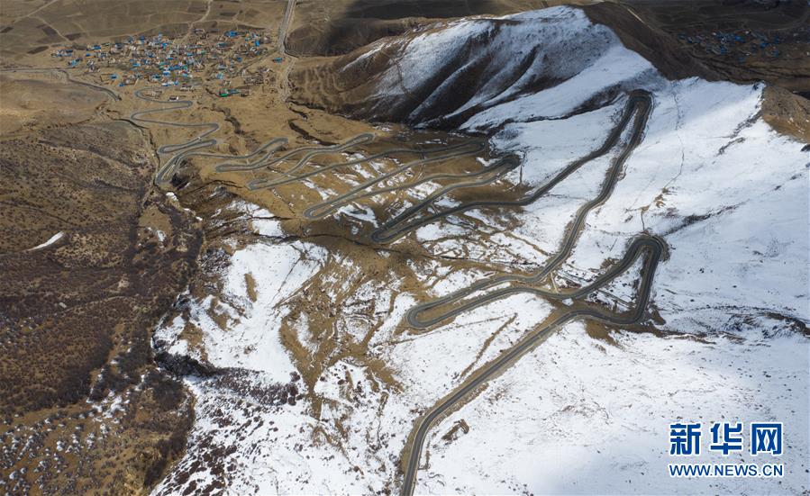通往甘丹寺的崎嶇山路(4月8日無人機拍攝)。 新華社記者普布扎西攝