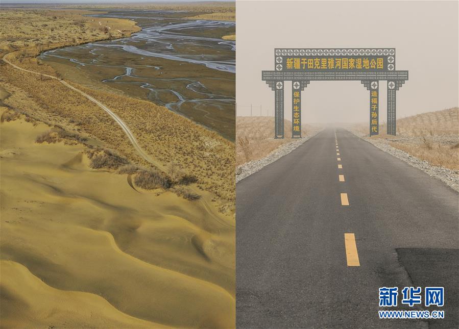 拼版照片:左圖為沿著克里雅河通向地處沙漠深處新疆于田縣達(dá)里雅布依鄉(xiāng)的路(3月19日無人機(jī)拍攝);右圖為從縣城通往達(dá)里雅布依小鎮(zhèn)易地扶貧安置點的柏油路(3月20日攝)。新華社記者 胡虎虎 攝