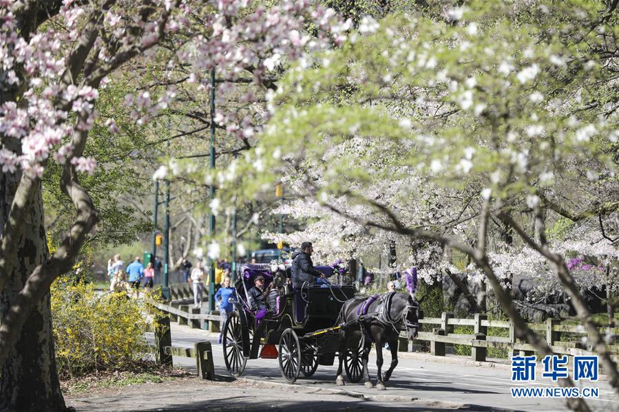 4月16日,人們?cè)诿绹?guó)紐約中央公園乘坐馬車游玩。 新華社記者 王迎 攝