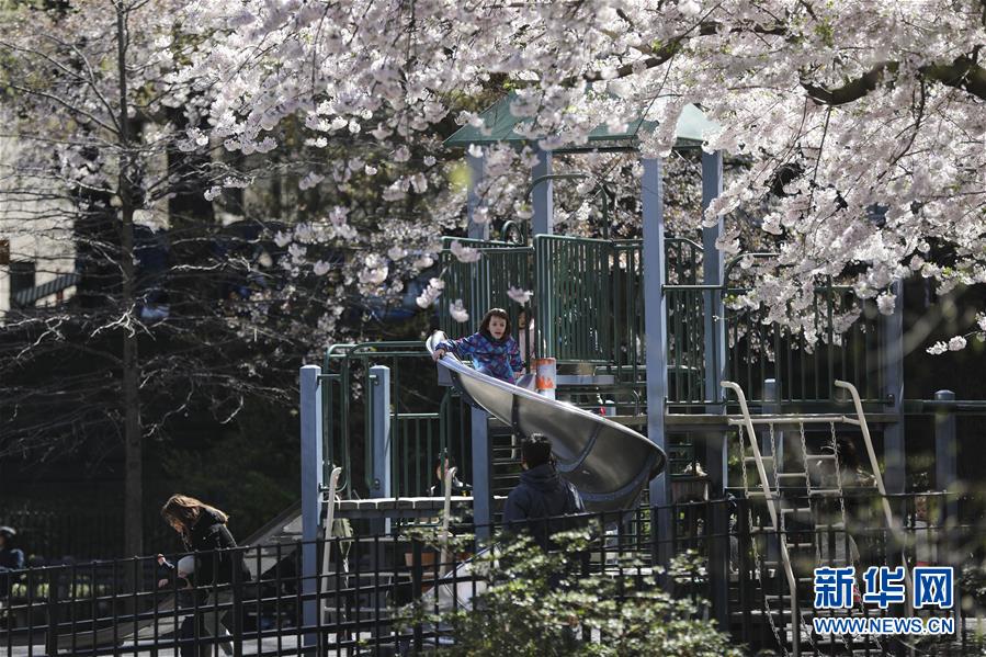 4月16日,孩子們?cè)诿绹?guó)紐約中央公園的一處游樂場(chǎng)玩耍。 新華社記者 王迎 攝