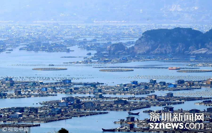2018年10月26日,在福建連江海域上,“海上田園”網(wǎng)箱羅列,漁排上搭建的木屋錯(cuò)落成“戶”,蔚為壯觀,成為一道獨(dú)特的風(fēng)景線。福建省連江縣是中國(guó)鮑魚養(yǎng)殖第一大縣。