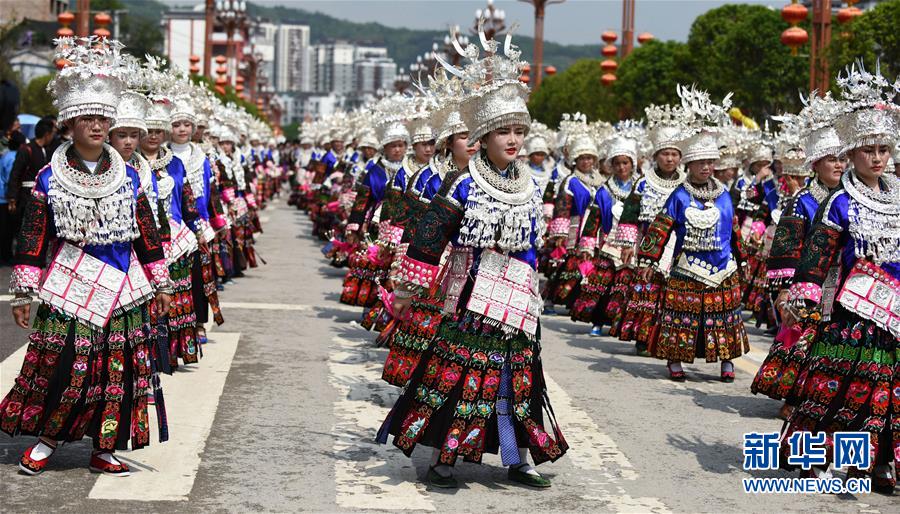 4月18日,臺江縣苗族群眾參加盛裝游演活動。 當(dāng)日,貴州省黔東南苗族侗族自治州臺江縣迎來一年一度的苗族姊妹節(jié)。節(jié)日期間將舉行苗族盛裝游演、千人長桌宴、千人游方體驗(yàn)、苗族手工創(chuàng)意大賽等一系列活動。 姊妹節(jié)是臺江縣苗族同胞的傳統(tǒng)節(jié)日,2006年被列入第一批國家級非物質(zhì)文化遺產(chǎn)名錄。 新華社記者 楊文斌 攝