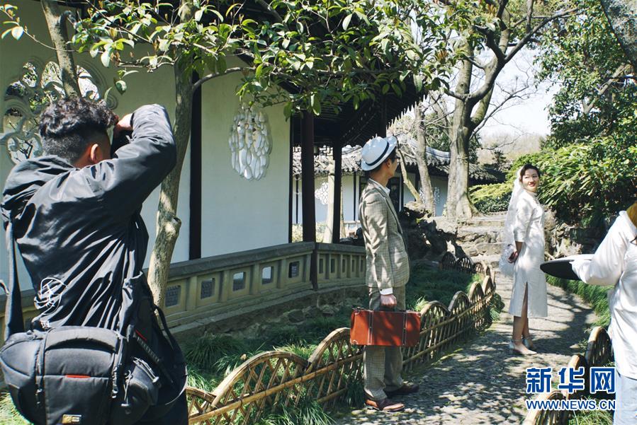 2019年4月1日,一對(duì)夫妻在中國蘇州滄浪亭內(nèi)拍婚紗照。2000年,滄浪亭和藝圃、耦園、獅子林、退思園作為蘇州古典園林的擴(kuò)展項(xiàng)目被列入聯(lián)合國教科文組織世界文化遺產(chǎn)名單。 新華社記者杜涓涓攝