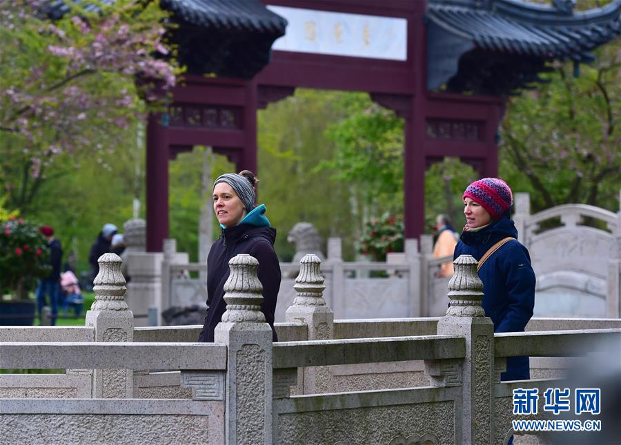 4月17日,在德國首都柏林,兩名游客在“得月園”內(nèi)參觀。“得月園”位于德國柏林東部的世界公園內(nèi),占地約2.7萬平方米,于1997年開工建造,2000年10月正式對(duì)外開放,自建成后以其獨(dú)特的中式園林魅力成為世界公園眾多不同風(fēng)格園林中一顆耀眼的明珠。 新華社記者單宇琦攝