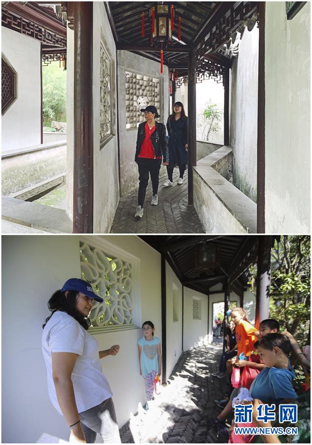 這張拼版照片展示的是:上圖,2019年4月2日,游客在中國蘇州留園內(nèi)游覽(新華社記者杜涓涓攝);下圖,2017年9月23日,在美國紐約寄興園舉行的迎中秋活動(dòng)上,孩子們?cè)谥驹刚叩膸ьI(lǐng)下參觀(新華社記者王迎攝)。