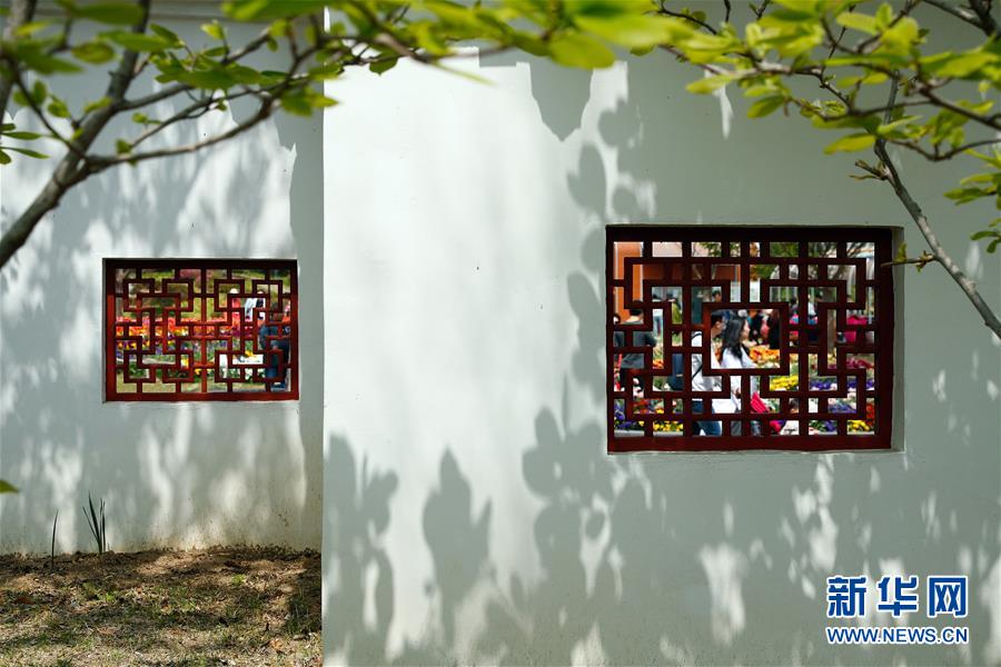 2017年4月27日,游客在美國紐約寄興園內(nèi)拍照。仿照中國蘇州園林設(shè)計(jì)建造的寄興園位于紐約斯塔滕島,占地面積約4000平方米,其所用的建筑材料大都在蘇州加工制造,并由40名來自蘇州的藝術(shù)家和工匠歷時(shí)6個(gè)月在紐約修建而成。 新華社記者王迎攝
