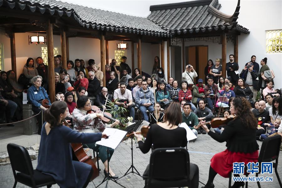 2018年2月24日,人們?cè)诿绹~約大都會(huì)博物館“明軒”欣賞演出,慶祝新春佳節(jié)。中式庭院“明軒”是中國第一個(gè)落戶海外的蘇式園林,位于美國紐約大都會(huì)博物館二層的玻璃天棚下,是模仿中國蘇州網(wǎng)師園中的“殿春簃”設(shè)計(jì)建造而成的。“明軒”由蘇州市園林管理局承建,所用的磚、瓦、木材、構(gòu)件等在中國備好后,由20余名中國工程師和工匠在美國組裝。 新華社記者王迎攝