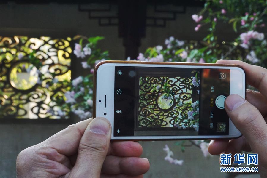 2019年4月1日,一名游客在中國蘇州耦園內(nèi)拍照。2000年,耦園和滄浪亭、藝圃、獅子林、退思園作為蘇州古典園林的擴(kuò)展項(xiàng)目被列入聯(lián)合國教科文組織世界文化遺產(chǎn)名單。 新華社記者杜涓涓攝