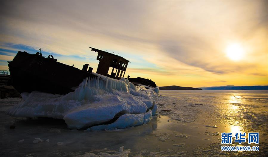 這是2017年3月28日在俄羅斯貝加爾湖奧利洪島上拍攝的日落時分的廢船。 新華社記者張帆攝