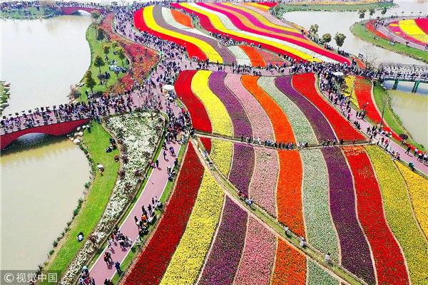 2019年4月6日,江蘇鹽城市大豐荷蘭花海的300萬株郁金香隨風盛開,吸引了眾多市民和游客前來觀賞。從空中看,一片片彩色的郁金香花田仿佛巨幅彩帶,將數(shù)百畝花海裝扮得分外美麗。楊素平/視覺中國